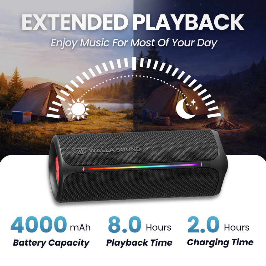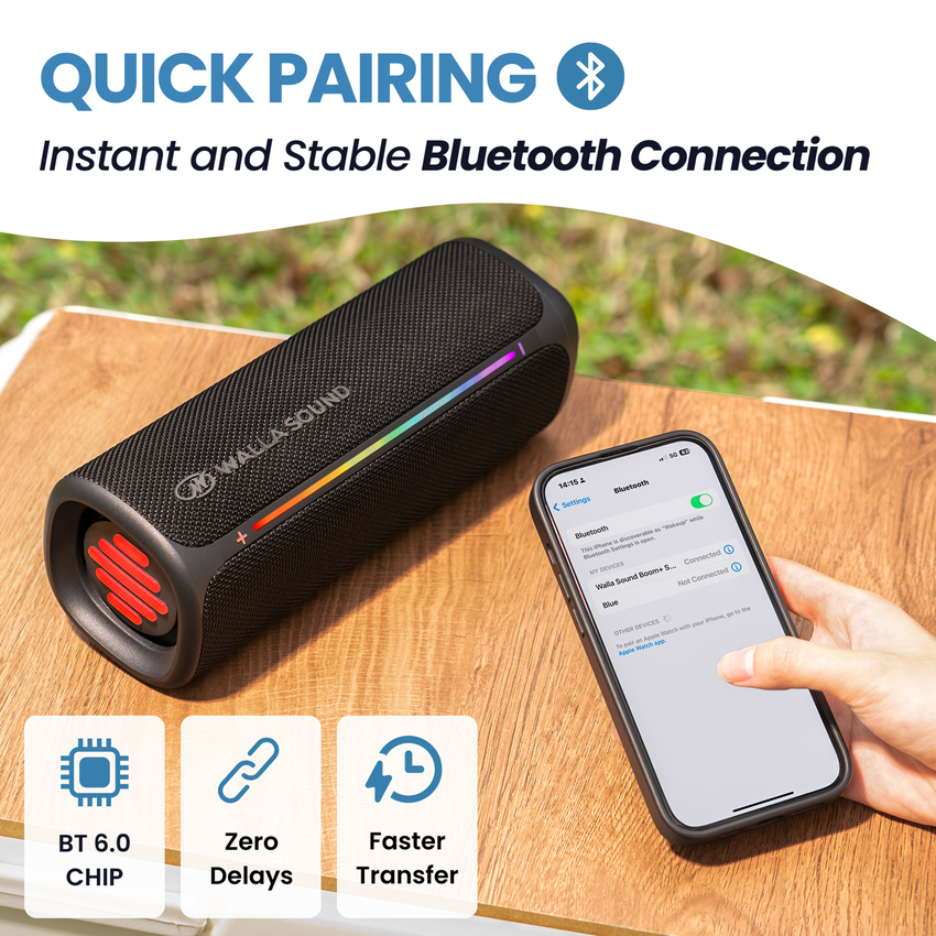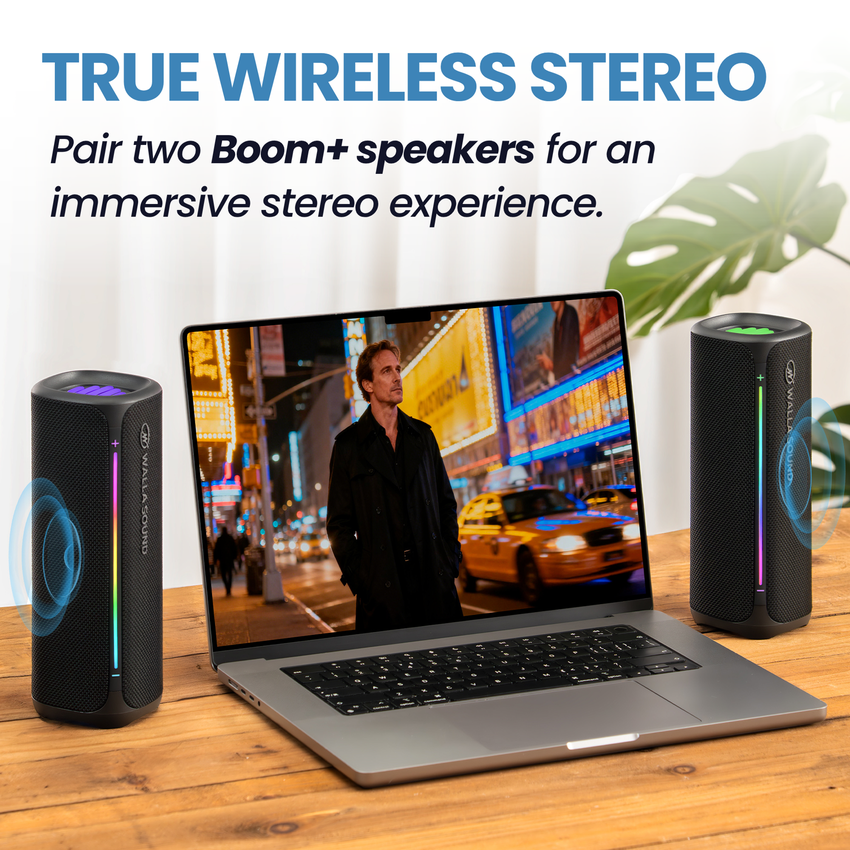 Whether at the beach, park, or home, the Walla Sound Boom+ delivers premium sound quality in a rugged, portable package. Enjoy high-fidelity audio, long-lasting power, and effortless wireless connection anytime, anywhere.